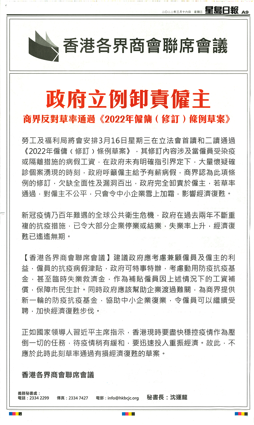 | 43 | 【香港各界商會聯席會議】《刊登報章聲明》【政府立例卸責僱主 商界反對草率通過《2022年僱傭﹙修訂﹚條例草案》】- 星島日報 | 16-03-2022 |