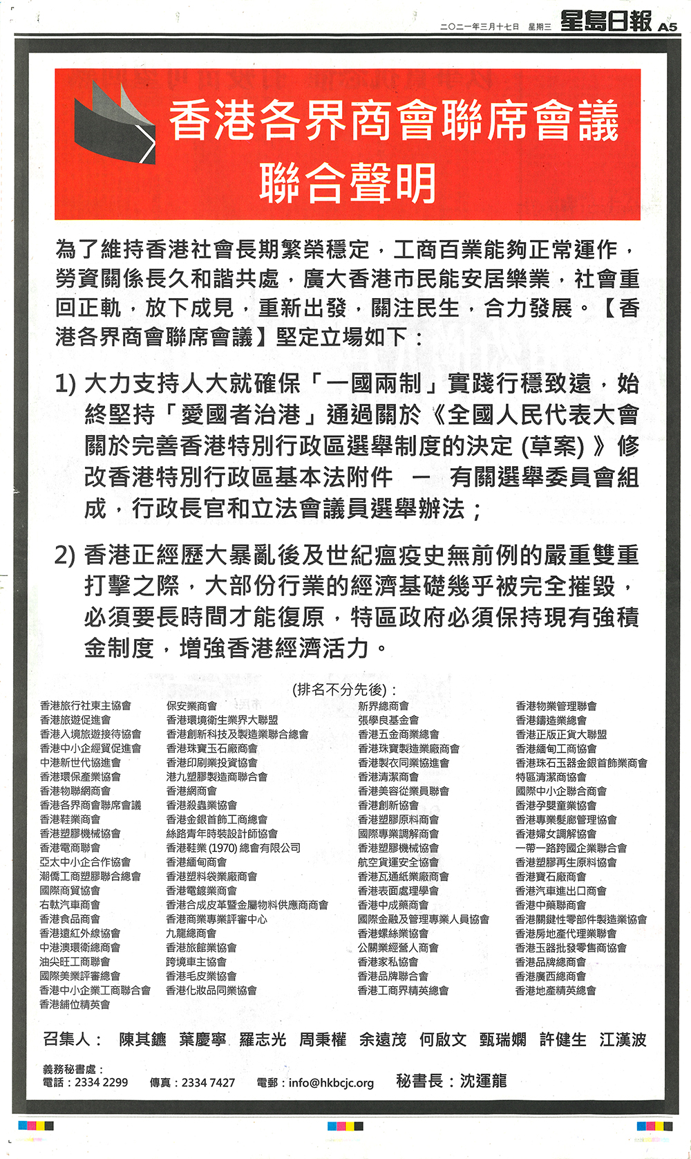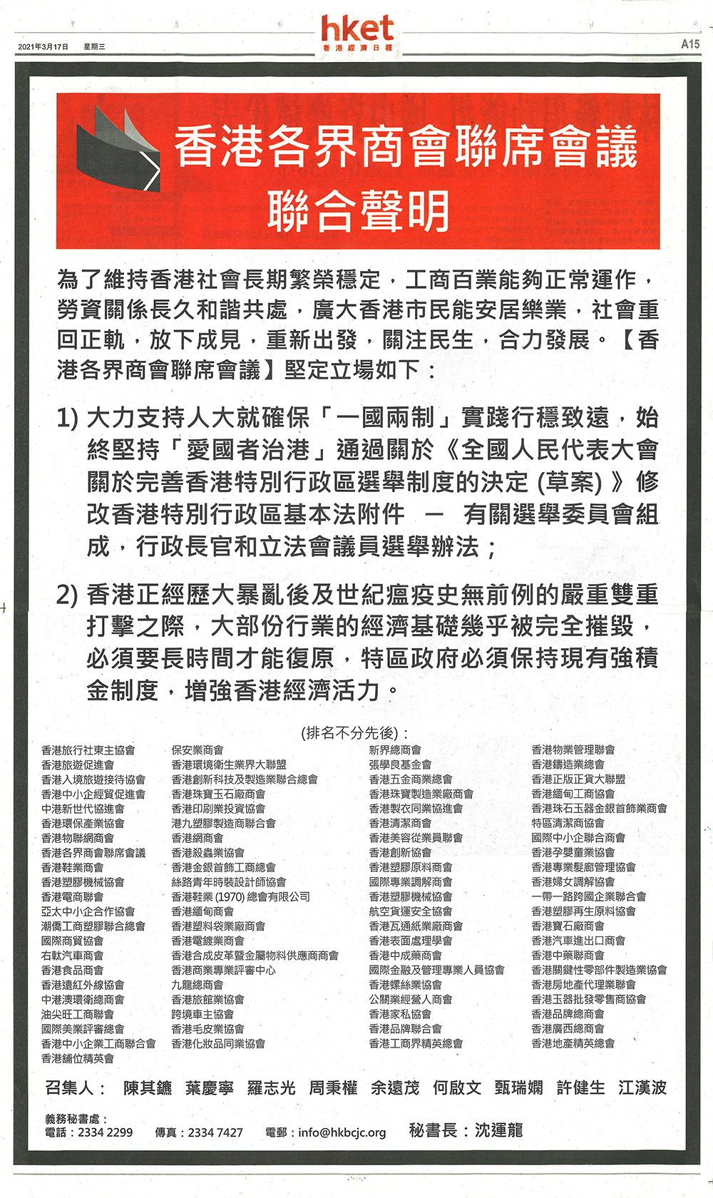 | 42 | 【香港各界商會聯席會議】《刊登報章聲明》【支持關於《全國人民代表大會關於完善香港特別行政區選舉制度的決定 (草案) 》修改】- 經濟日報 及 星島日報 | 17-03-2021 |