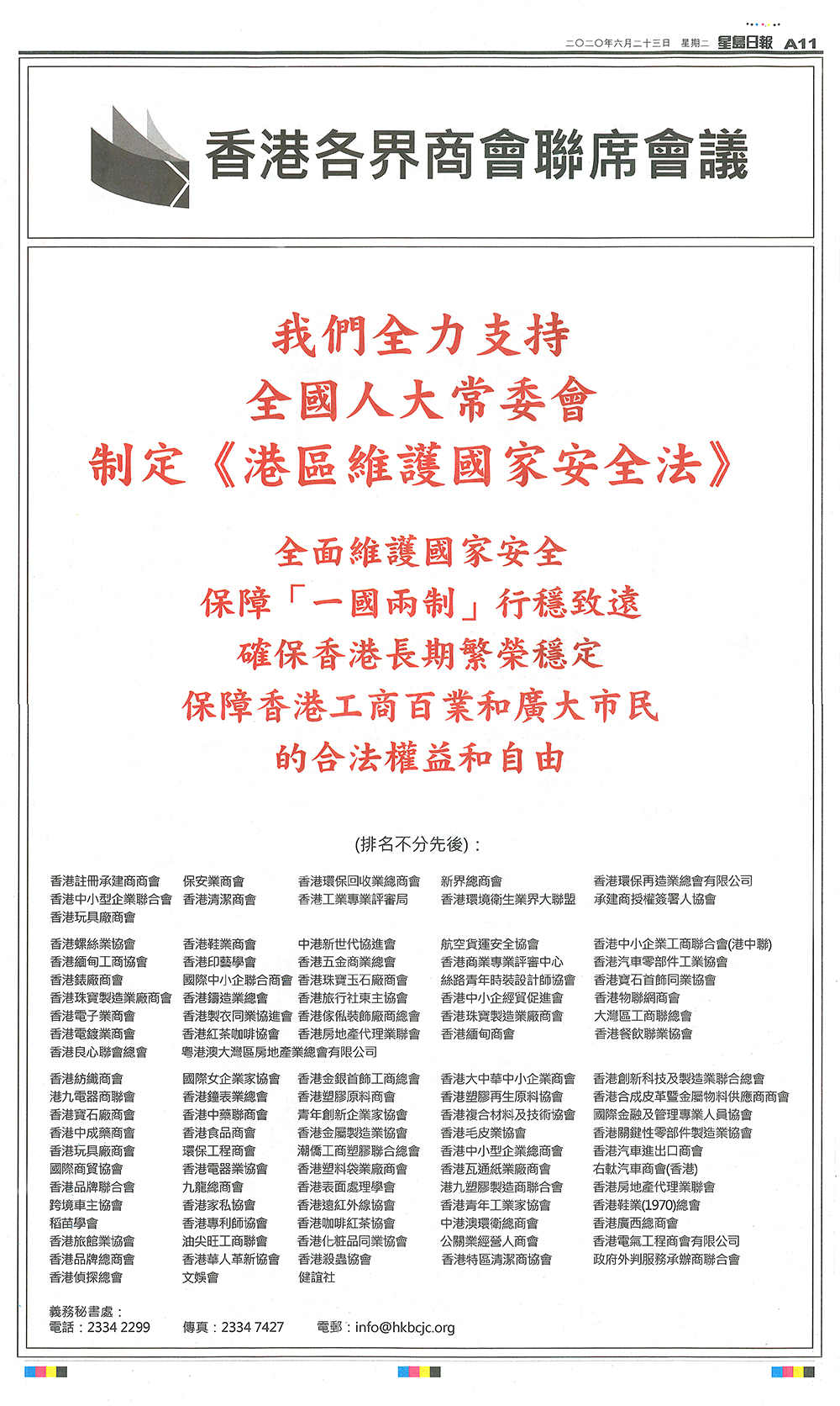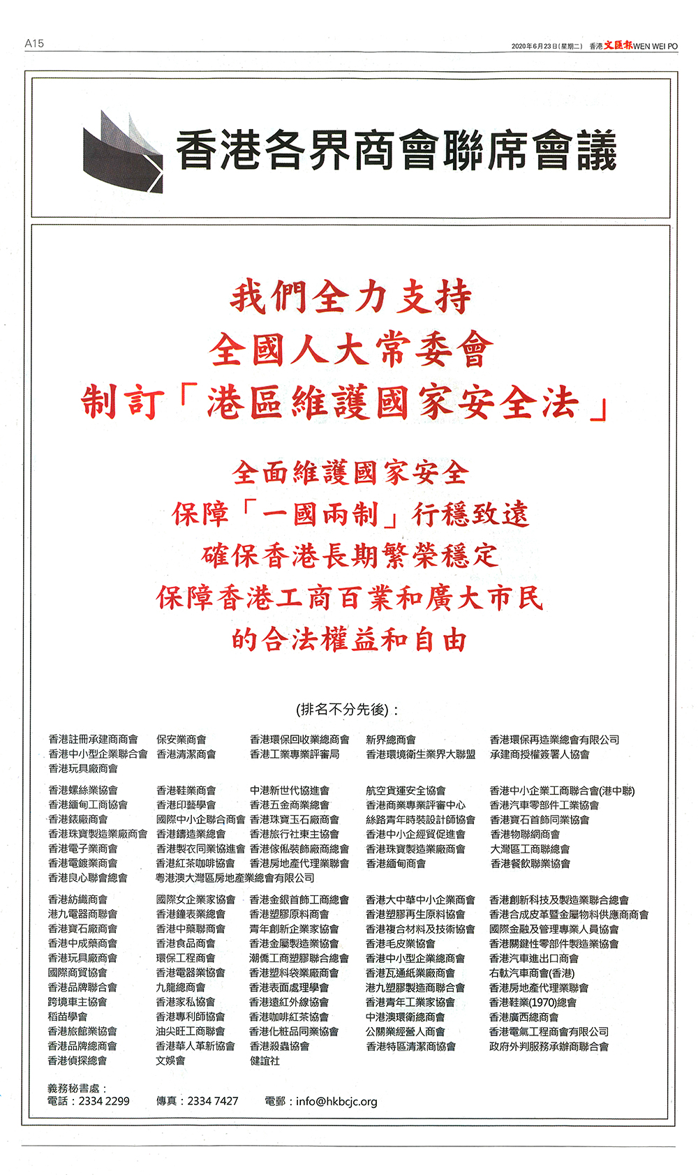 | 39 | 【香港各界商會聯席會議】《刊登報章聲明》【我們全力支持全國人大常委會制定《港區維護國家安全法》】- 文匯報 及 星島日報 | 23-06-2020 |