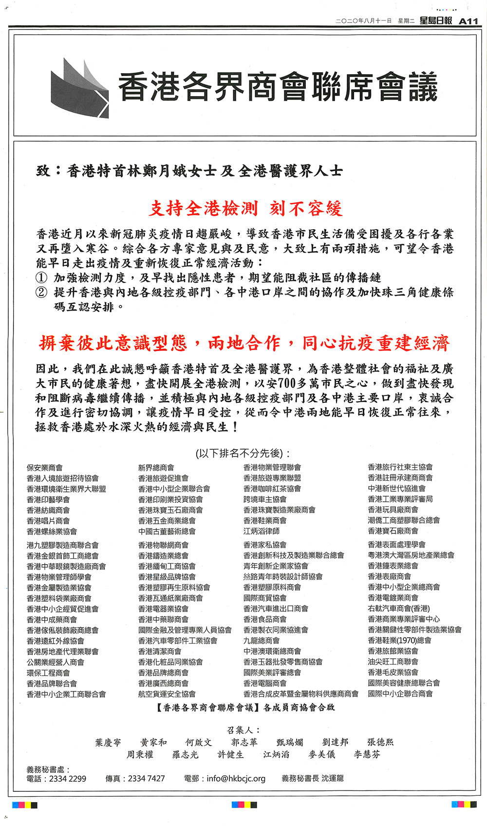| 40 | 【香港各界商會聯席會議】《刊登報章聲明》【支持全港檢測 刻不容緩】- 星島日報 | 11-08-2020 |