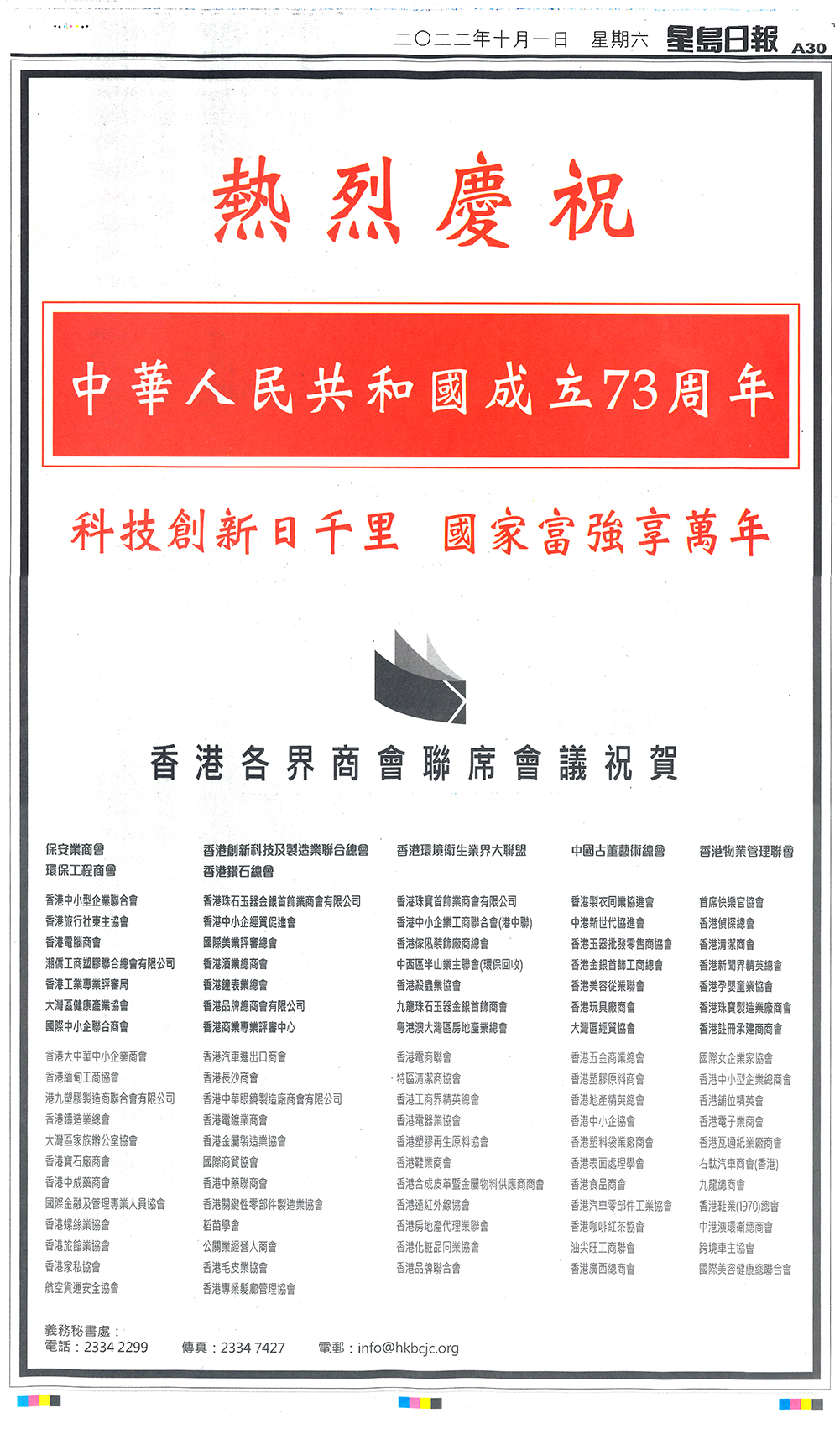 | 44 | 【香港各界商會聯席會議】《刊登報章聲明》【熱烈慶祝 中華人民共和國成立73周年】- 星島日報 及 堅雜誌 | 01-10-2022 |