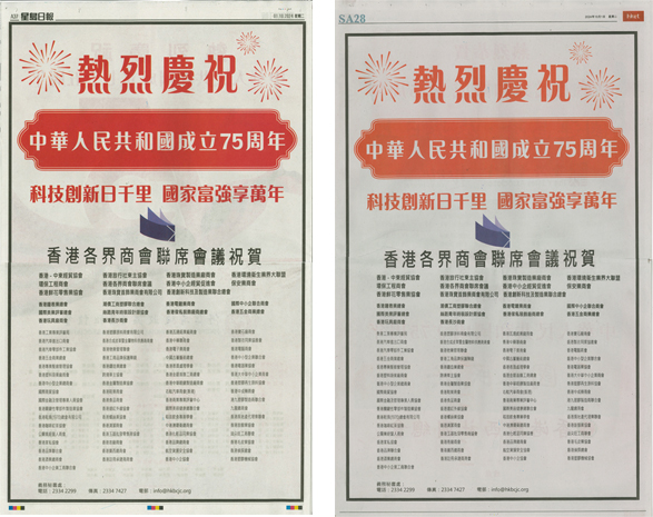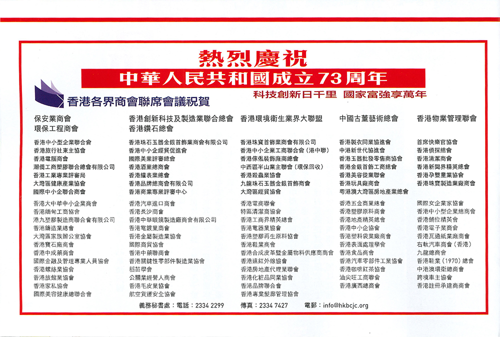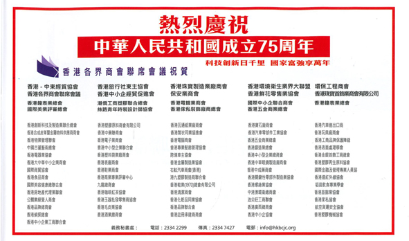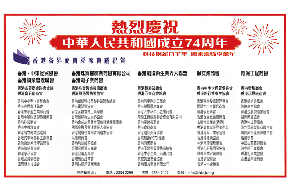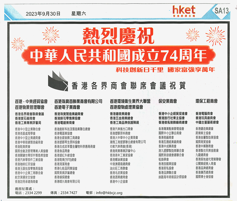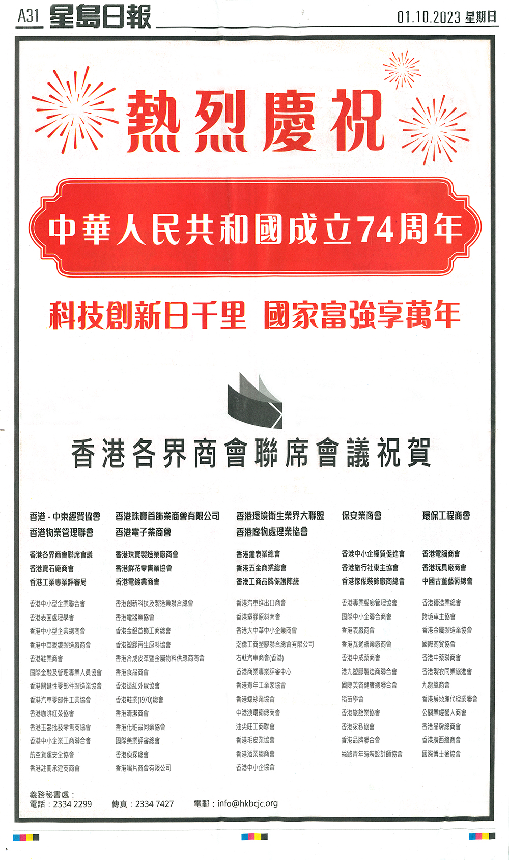 | 45 | 【香港各界商會聯席會議】《刊登報章聲明》【熱烈慶祝 中華人民共和國成立74周年】- 星島日報, 經濟日報 及 堅雜誌 | 01-10-2023 |