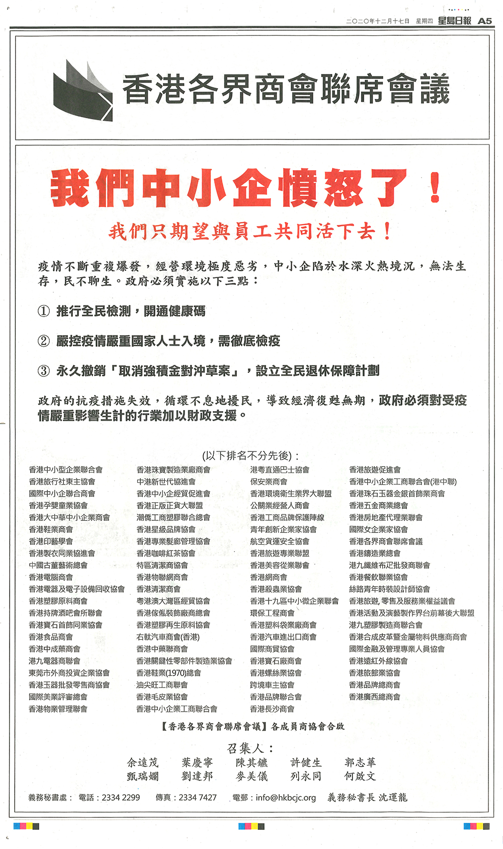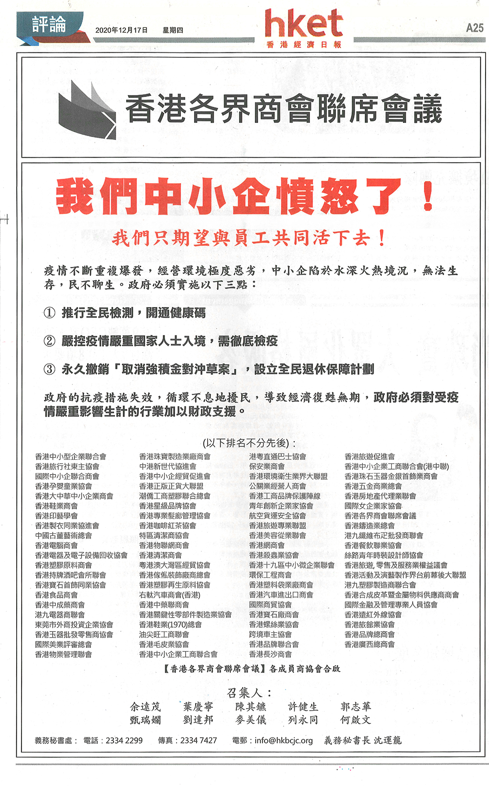 | 41 | 【香港各界商會聯席會議】《刊登報章聲明》【我們中小企憤怒了! 我們只期望與員工共同活下去!】- 經濟日報 及 星島日報 | 17-12-2020 |