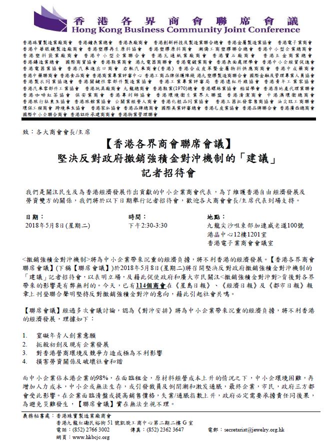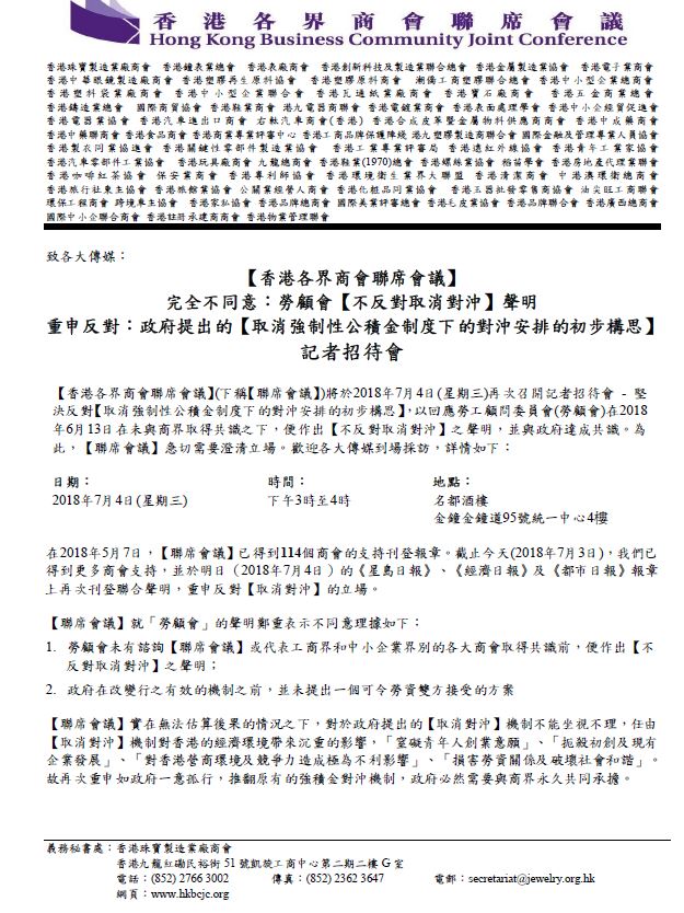 | 34 | 反對《取消強制性公積金制度下的對沖安排的初步構思》記者招待會 | 08-05-2018 |
